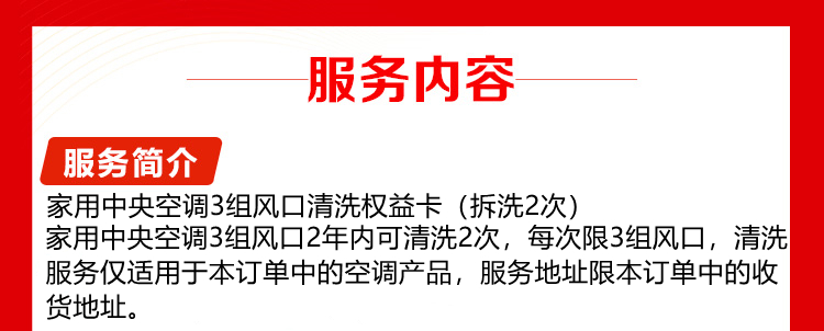 【京东家电清洗权益卡】家用中央空调3组风口拆洗服务套餐2年2次权益卡
